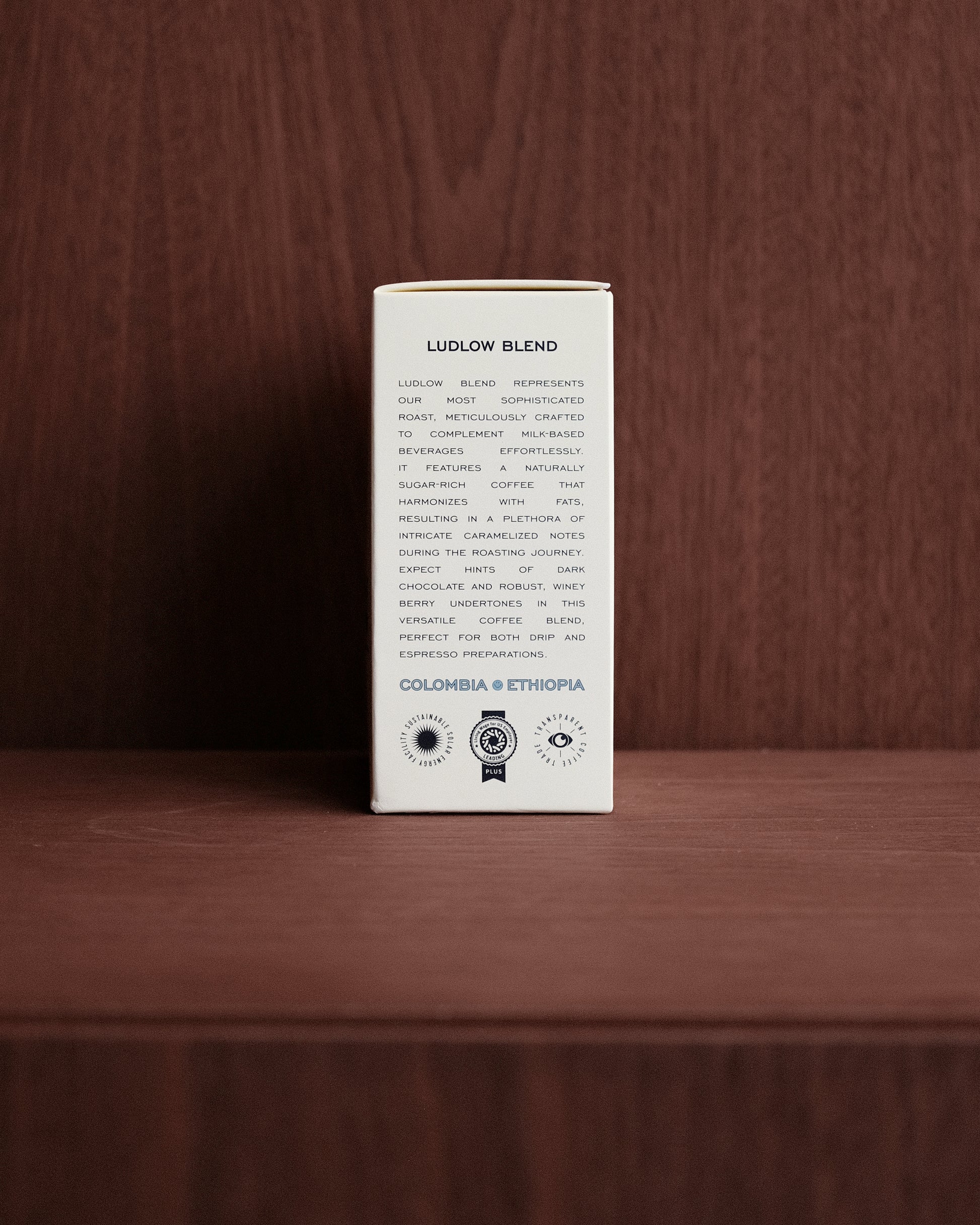 LUDLOW BLEND REPRESENTS OUR MOST SOPHISTICATED ROAST, METICULOUSLY CRAFTED TO COMPLEMENT MILK-BASED BEVERAGES EFFORTLESSLY. IT FEATURES A NATURALLY SUGAR-RICH COFFEE THAT HARMONIZES WITH FATS, RESULTING IN A PLETHORA OF INTRICATE CARAMELIZED NOTES DURING THE ROASTING JOURNEY. EXPECT HINTS OF DARK CHOCOLATE AND ROBUST, WINEY BERRY UNDERTONES IN THIS VERSATILE COFFEE BLEND, PERFECT FOR BOTH DRIP AND ESPRESSO PREPARATIONS.